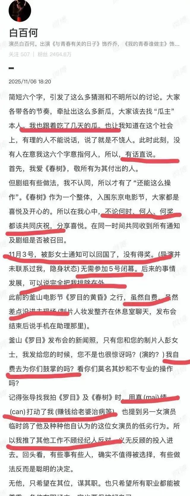 当颁奖礼结果揭晓那刻,所有猜测都变成现实魔幻主义——戏份吃重的女主颗粒无收鑫耀证券,配角演员逆袭封帝。这剧情连《甄嬛传》编剧都不敢写,偏偏在现实世界上演。那些原本等着喝庆功酒的粉丝瞬间炸锅,有人把评审团照片P成"选择性失明"表情包,有人开始深扒王传君是不是救过评委会主席的命,舆论场秒变修罗场。就在舆论快要失控时,白百何那份手写长文像颗催泪弹砸来。原来光鲜亮丽的国际电影节背后,藏着这么多不为人知的辛酸。最让人破防的是她透露当初接戏时的情况——导演抱着剧本三顾茅庐,说着说着就开始抹眼泪,而她已经签好某S+级商业片合约。这抉择堪比高考志愿填报现场:选稳稳当当的985还是搏一把艺术梦想?